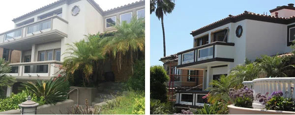 There are key areas to focus on when planning a color scheme. The field color - or the predominate and most noticeable color, the accent color for doors and shutters, and the trim color that includes windows, railings, roof edges, patio ceilings and accent trims. We also considered the home elements that would not be changing - the landscape, hardscape and the roof. We found a palette that was compatible with the existing roof tiles and one that matched the Mediterranean style of the home as well.